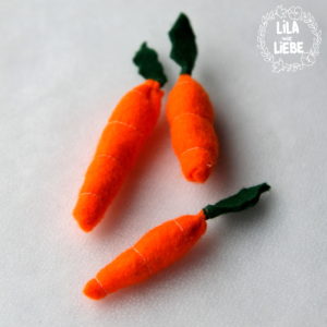 Wir beginnen mal mit den kleinen Möhren und Erdbeeren – die Anleitung habe ich von Mamahoch2 (Möhren und Erdbeeren). Dort gibt es auch noch weitere Kaufladen-Utensilien zum Nachnähen. Sie sind wirklich sehr schnell und einfach gemacht… ganz angenehm, um sich am Abend ein paar Minuten zu betätigen!