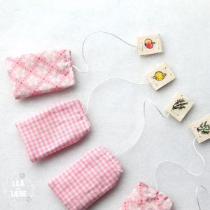 Schließlich gibt es noch ein paar Teebeutel aus Stoff dazu. Ich habe sie einfach mit einer Lage Vlies gefüttert; die Schildchen sind aus Pappe (mögen sie lange halten!!!), worauf ich die Teesorte gezeichnet habe (Apfel, Zitrone, Kräuter, Erdbeere).